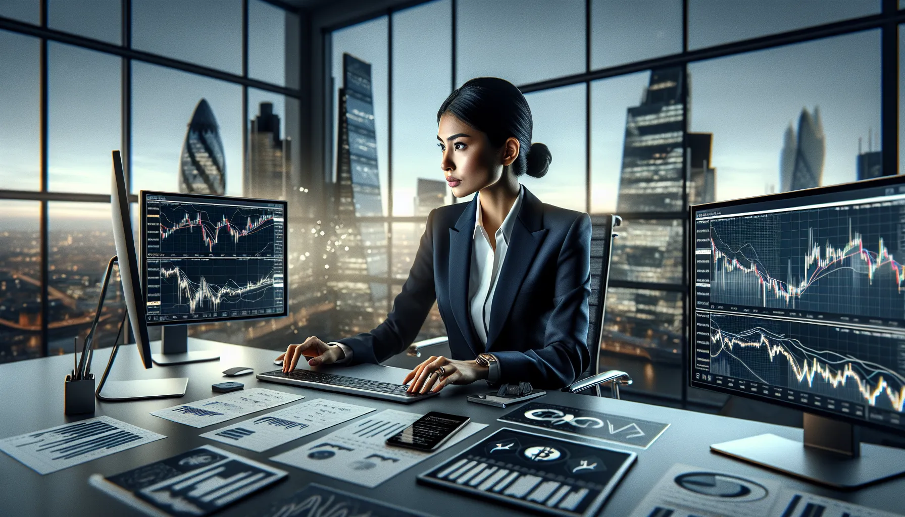 Professional desk displaying Litecoin price chart on monitor with regulatory documents and financial analysis tools.